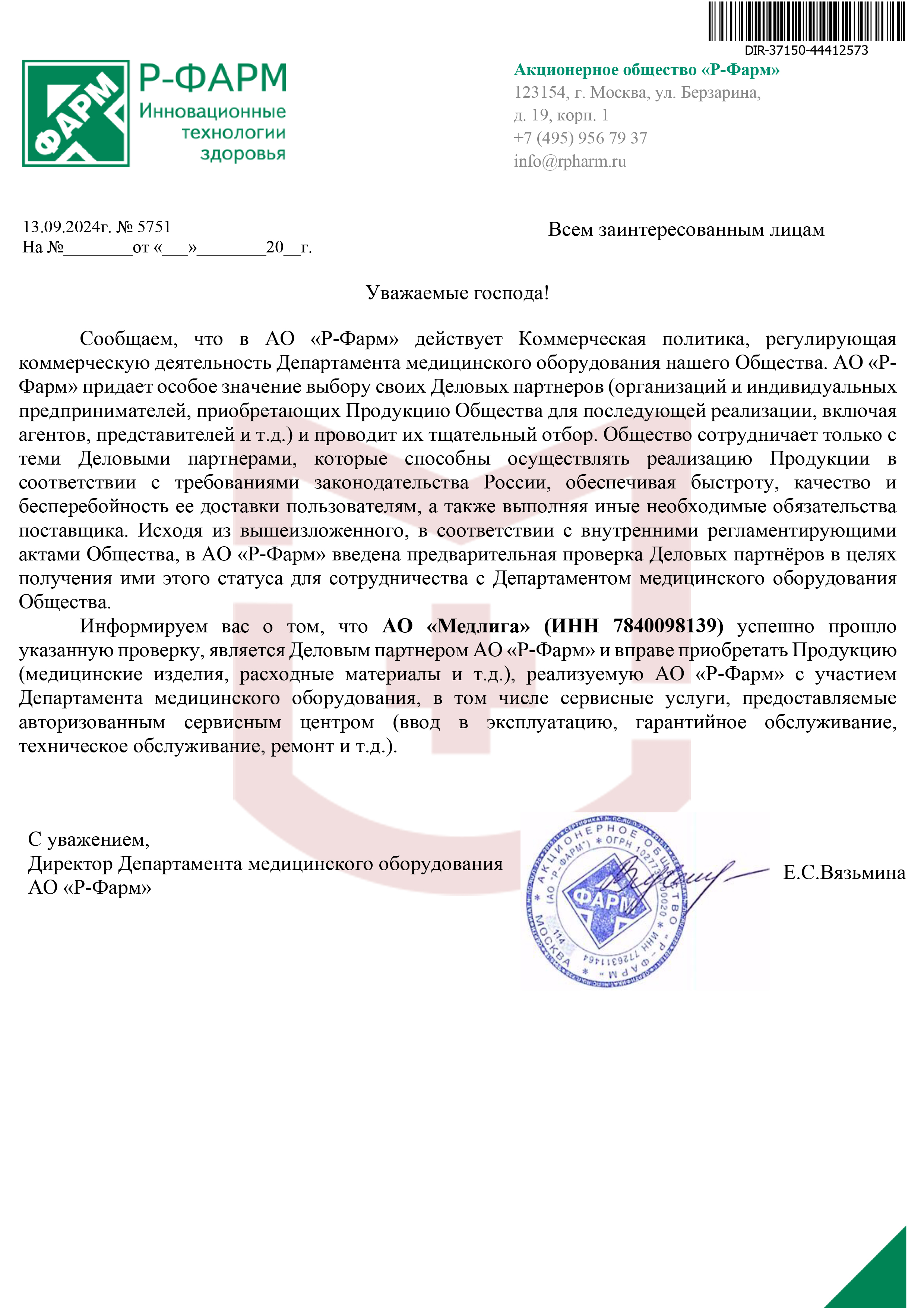 Авторизационное письмо «Р-Фарм» от 2024 года