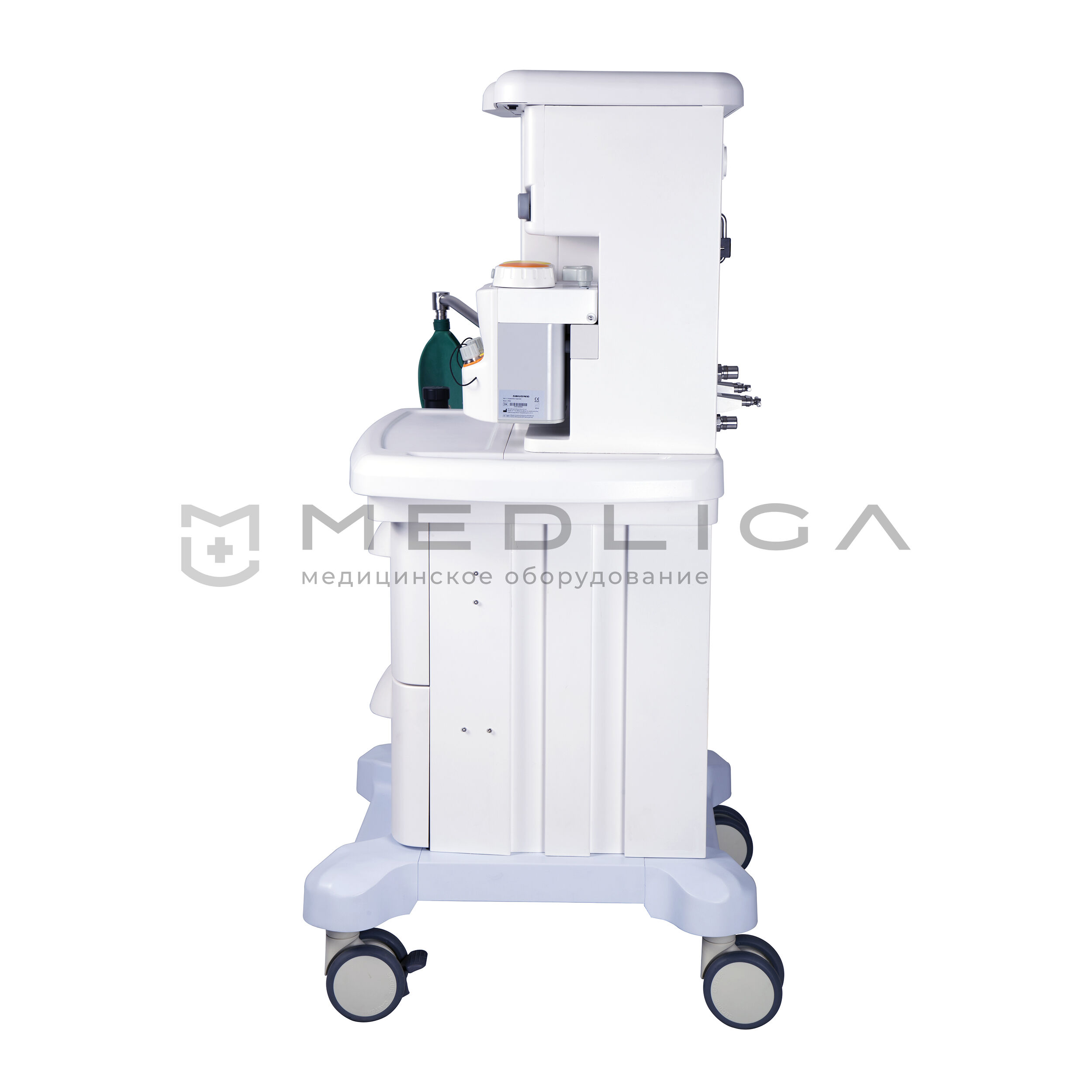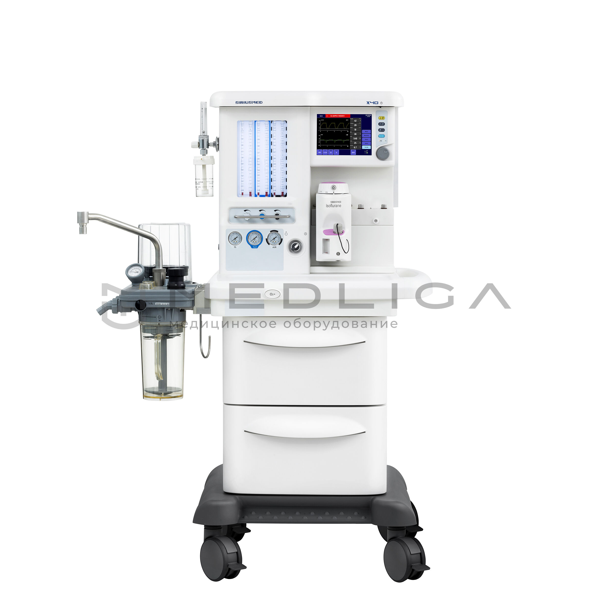Тележка. Базовая комплектация уже имеет расширенную комплектацию для работы анестезиолога. Трехгазовая версия (О2, AIR, N2O). База на два испарителя Selectatec Interlock. Рельсы с обеих сторон для крепления монитора пациента и ПК. Крепление для двух резервных баллонов О2 и N2O. Три встроенные медицинские розетки 220В для дополнительного оборудования. Светодиодная подсветка рабочего столика и механических ротаметров. Центральный тормоз фиксирует все 4 колеса одной педалью. Подставка для ног врача. Встроенная батарея на 90 минут. Два вместительных выдвижных ящика. Встроенные порты VGA и USB.