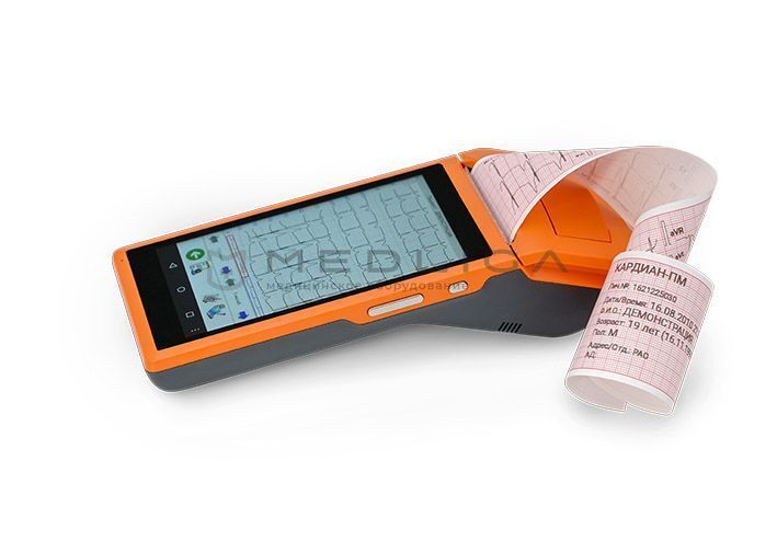 - Состоит из электрокардиографического преобразователя и карманного персонального компьютера (КПК) в виде планшета c цветным сенсорным дисплеем и со встроенным термопринтером