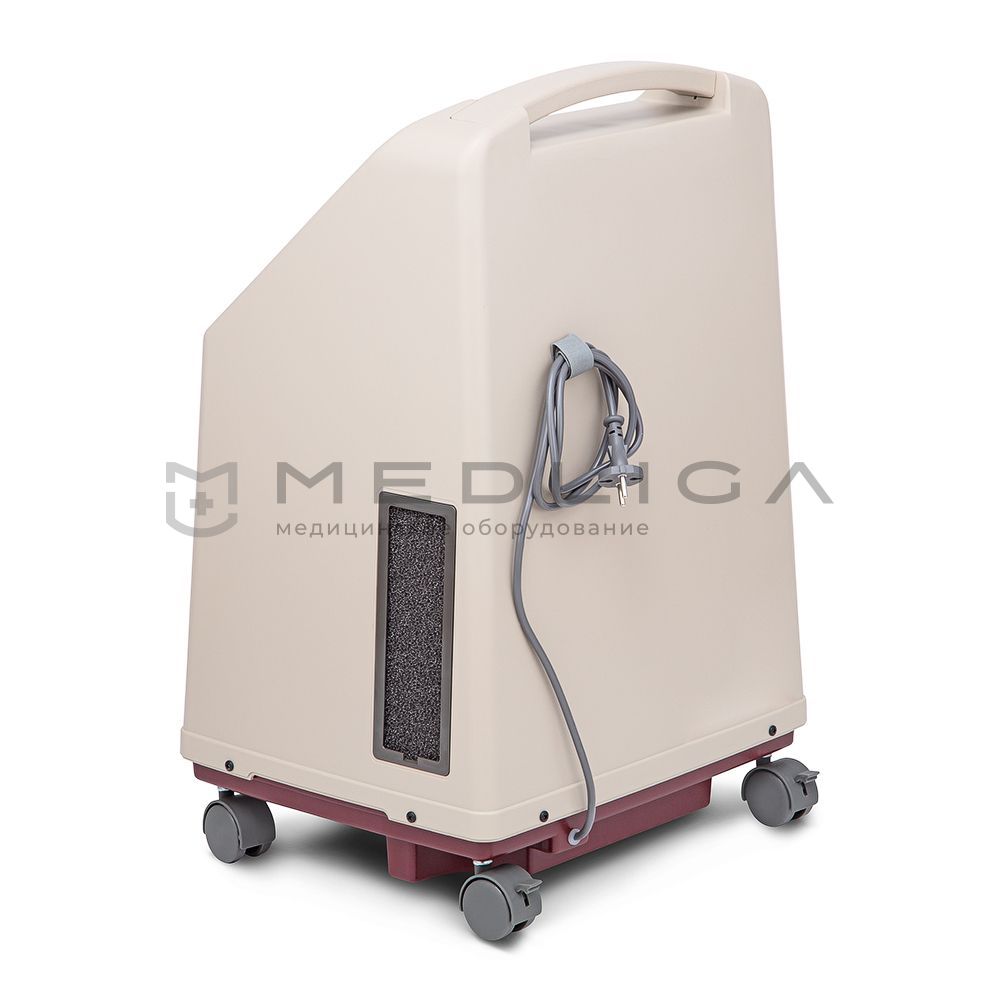 Корпус концентратора кислорода выполнен из надежного ударопрочного пластика и снабжен удобными боковыми ручками, а также колесными опорами для легкого перемещения по дому.