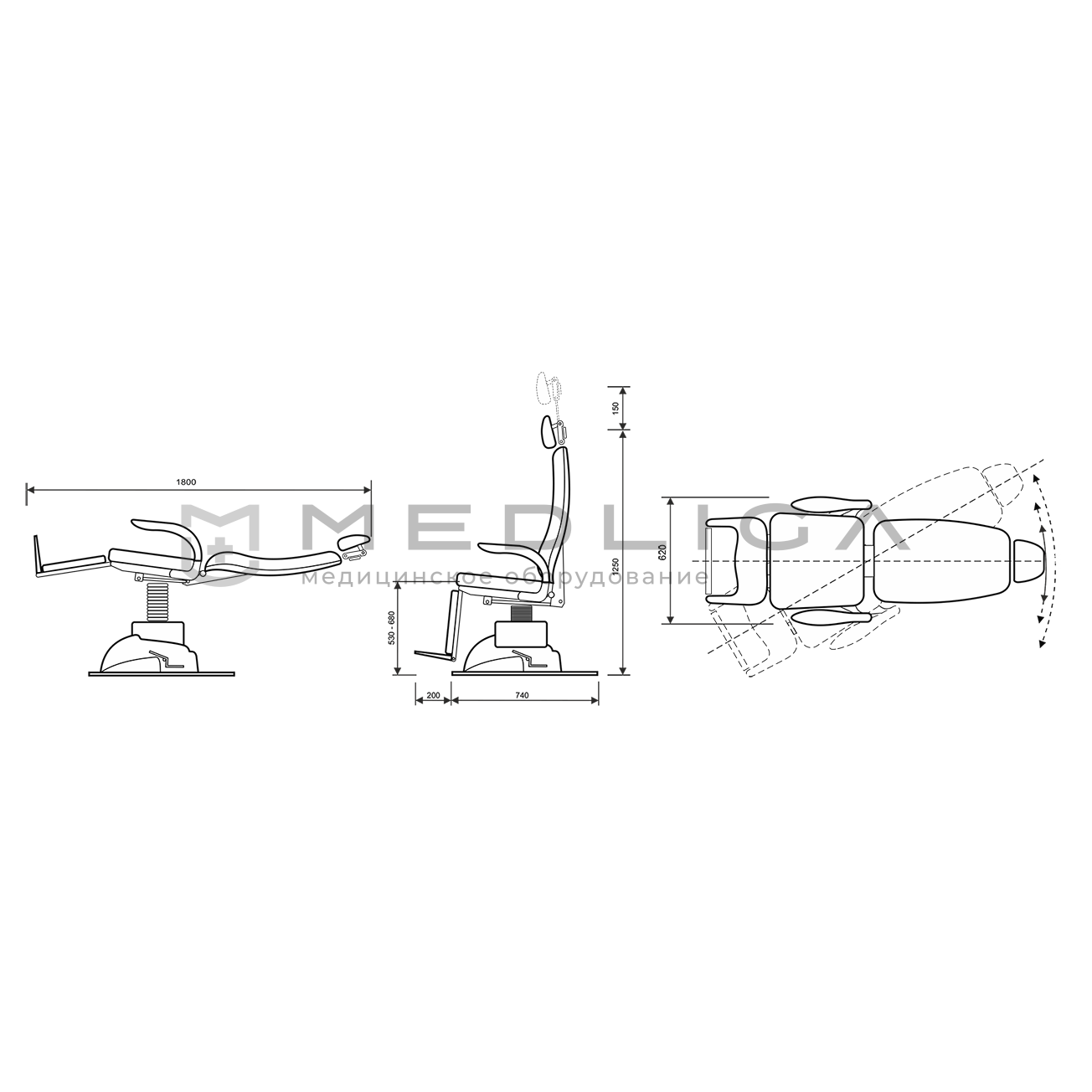 Положение "операционный стол" Возможность опустить спинку кресла до положения 180° с помощью ручного рычага с пневматической пружиной, расположенного сбоку от сиденья. Гидравлическая система для подъема, запускаемого газовым насосом через ножной блок управления, расположенный в нижней задней части основания;