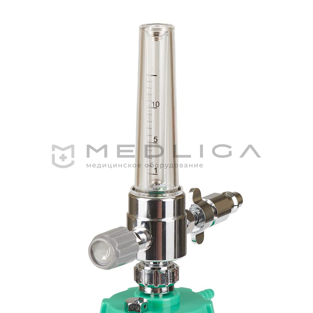 Увлажнитель кислорода оборудован стеклянным ротаметром с металлическим поплавком для определения уровня расхода жидкости. А для контроля потока кислородной смеси имеется механический регулятор.